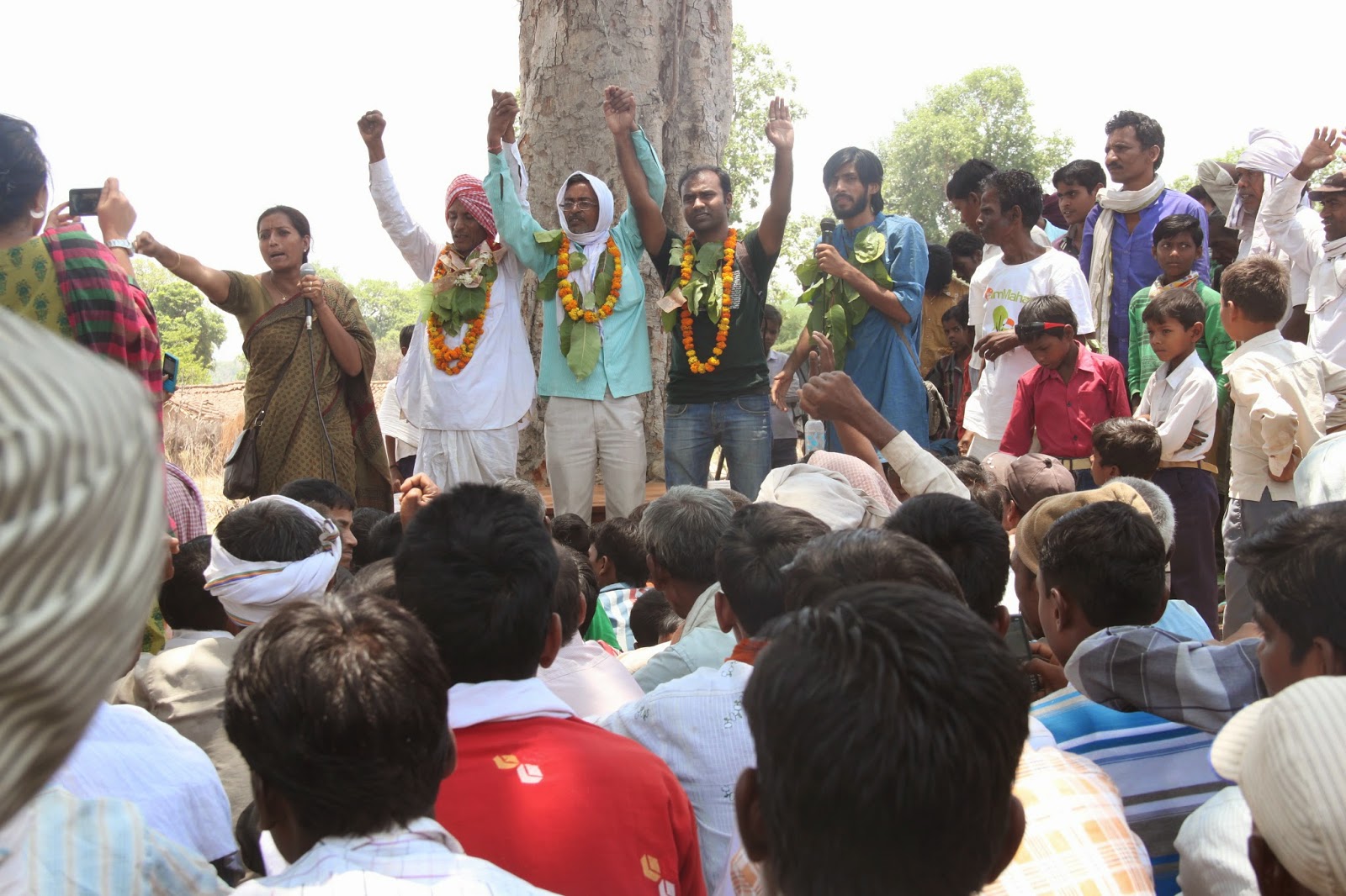 सिंगरौली। 5 जून 2014। महान जंगल क्षेत्र के ग्रामीण एक बार फिर पुलिस-प्रशासन और कंपनी के साझेदारी के खिलाफ खड़े हुए। वन सत्याग्रही बेचनलाल साह के जेल से बाहर आने के बाद आज अमिलिया में उनके स्वागत में एक सभा का आयोजन किया गया। इस सभा में पर्यावरण दिवस के अवसर पर ग्रामीणों ने महान जंगल को बचाने का संकल्प भी लिया।